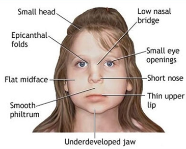 mała głowa,małe szeroko rozstawione oczy,krótki zadarty nos,brak rynienki pod nosem,krótki nos,płaska środkowa częśc twarzy,cieńka górna warga,kat oka nie przylegajacy do nosa,nierozwinięty podbródekNiestety dzieci urodzone przez narkomanów, palaczy, czyli osoby z wadliwą regulacją emocjonalną, dysfunkcyjnym sposobem interpretacji rzeczywistości, brakiem bezpieczeństwa wewnętrznego, często rodzą się z predyspozycją do uzależnień.